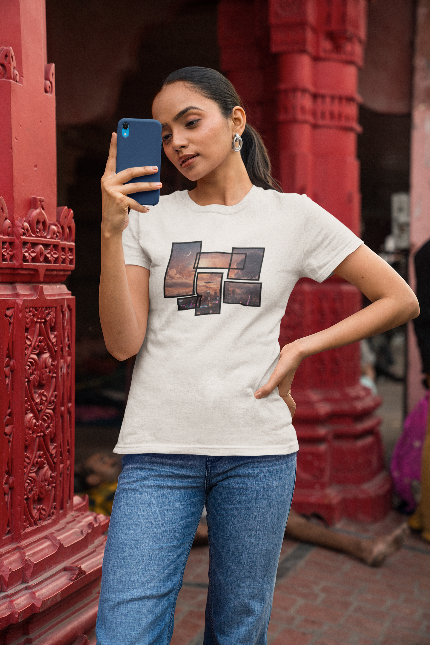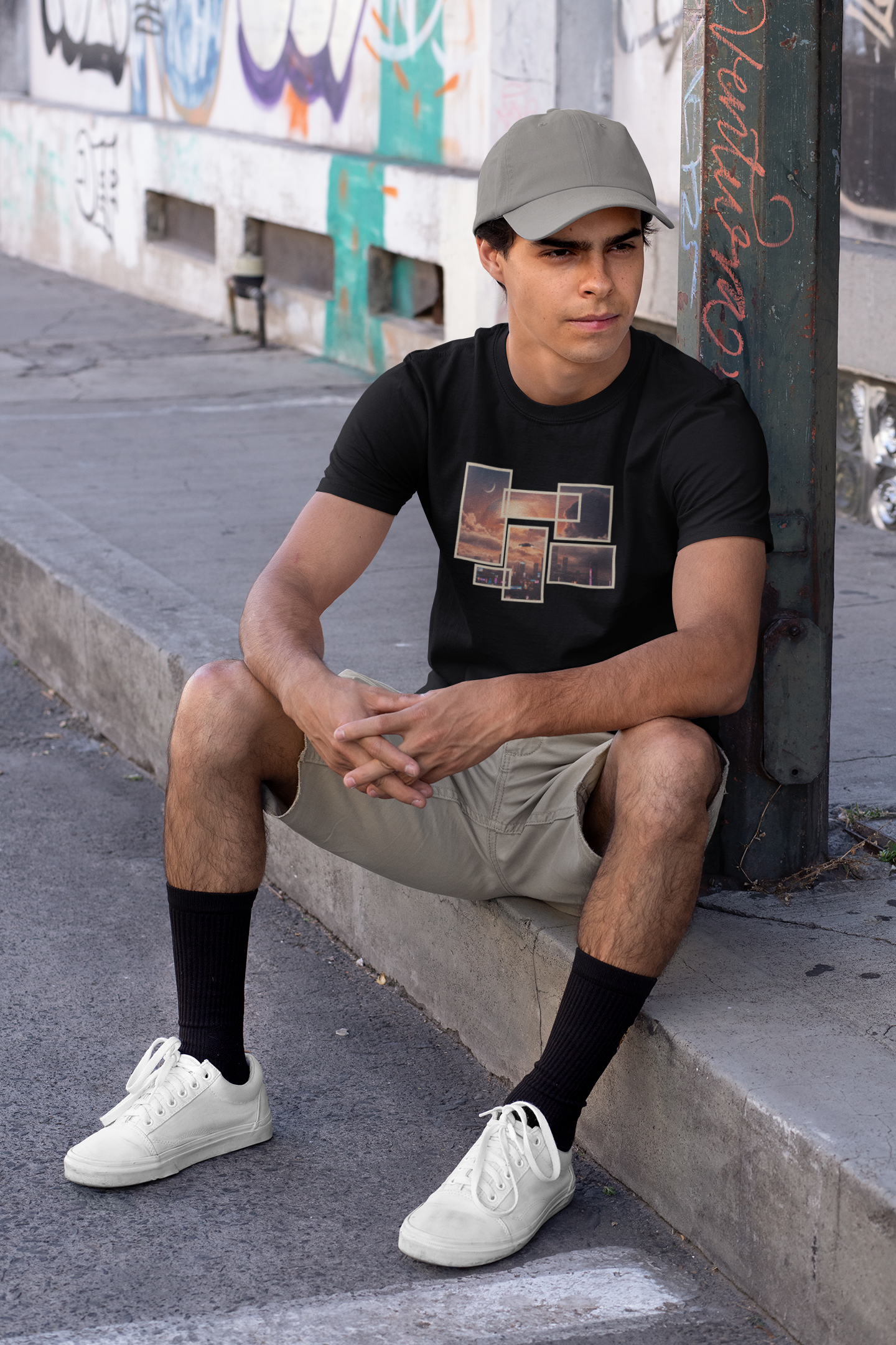 Geometric Sci-Fi cityscape T-Shirt inspired by artist Piet Mondrian's and his modern 'Neo-Plasticism' art style approach. Perfect for those who appreciate a futuristic Cyberpunk esc design. Unique Limited Edition 'Pebbel Brown' T-Shirt design (unlike other colour variations).